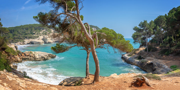 Panoramic view from an empty Cala Macarelleta, with turquoise waters and blue sky, in Menorca, Balearic Islands, Spain