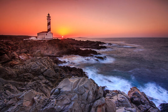 Minorca's vibrant coastline featuring a distant lighthouse.