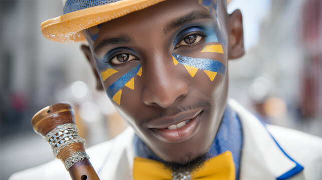 Vibrant Cape Town Minstrel Carnival participant in colorful attire and face paint, Kaapse Klopse, South Africa