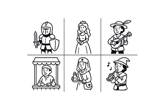 hand drawn cute doodle style line isolated on white background medieval fair (characters): knight noble bard vendor healer minstrel