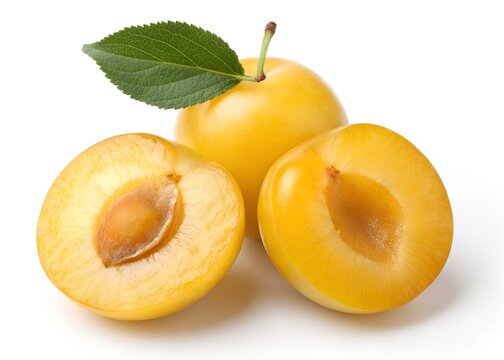 Juicy yellow plums and a half of yellow plum fruit with leaves, isolated on white background.