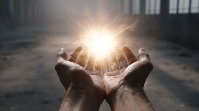 Open hands cupped upwards receiving bright light and radiating energy in  dim atmospheric space with  dark blurred background and concrete floor