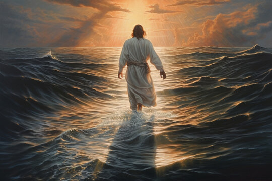 Jesus walking on the water. This artwork portrays the miraculous event from biblical narratives, conveying a sense of divine power, faith, and the transcendent nature of Jesus presence. Ai generated