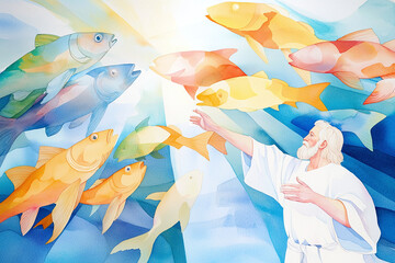 religious watercolor illustration of Peter's miraculous catch of fish