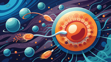A dynamic depiction of sperm reaching an egg cell during fertilization, capturing the miraculous moment of conception. The scene emphasizes movement, life, and the beginning of creation, rendered with