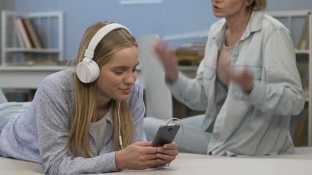 Unruly daughter ignoring mother lecturing, disobedient girl, adolescence concept