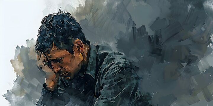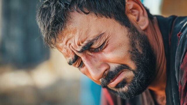 dramatic portrait of middle eastern man crying in despair. his face expresses deep anguish and pain. concept of human suffering, grief, and loss. website header, banner with copyspace.