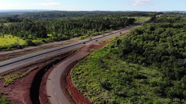 Panoramic view from Iguazu River on shores with subtropical rainforest. Iguazu National Park is in Misiones Province, Argentina.