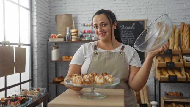 Young woman baking fresh pizza in her modern kitchen at home, happily removing food from oven