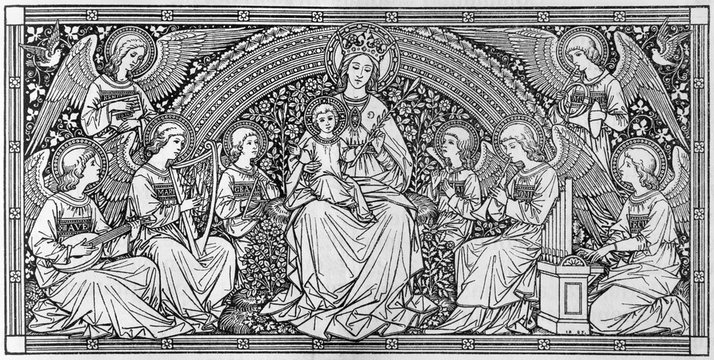 BRATISLAVA, SLOVAKIA, NOVEMBER - 21, 2016: The lithography Madonna among the virgins designed by unknown artist with the initials F.M.S (1888) and printed in Germany by Typis Friderici Pustet.
