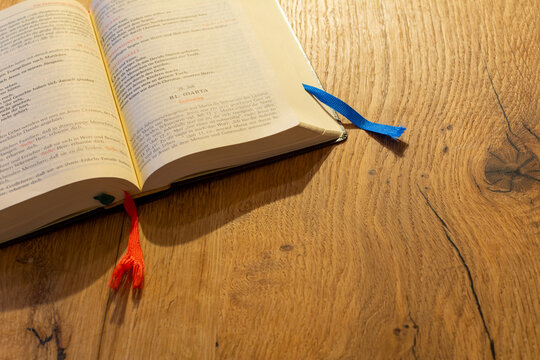 Open catholic missal book on a wooden desk background. Faith, religion gospel, and spirituality concept