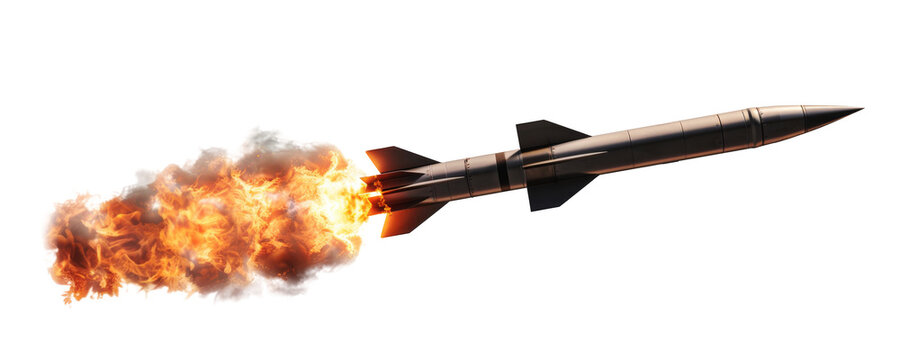 powerful missile launches into sky, leaving trail of fire and smoke against dramatic cloud filled backdrop