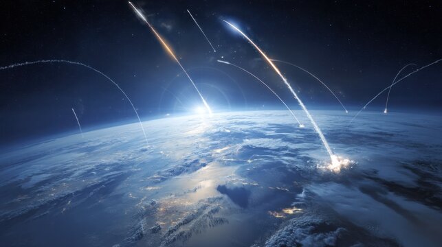 A space-based missile defense system firing interceptors to destroy incoming nuclear warheads, outer space view, earth in background
