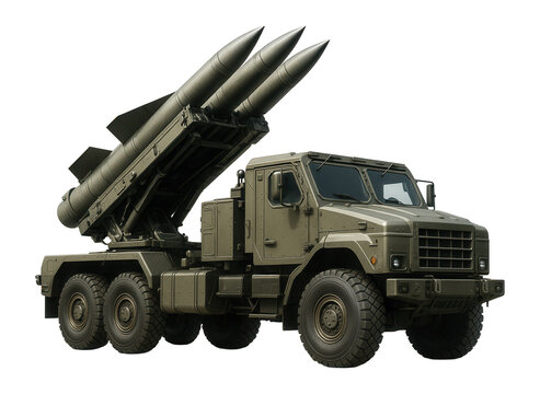 Military missile launcher vehicle equipped with three large missiles on transparent background.