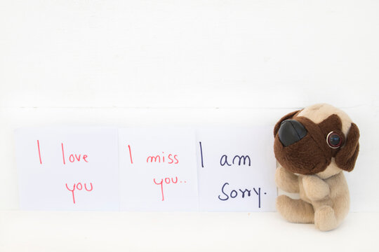 i love you, i miss you, i am sorry message card handwring with dog toy arrangement flat lay style on background white