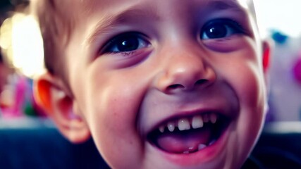 Close-up video of a young boy with a missing tooth, expressing excitement at a birthday party with soft, diffused lighting and a static camera.