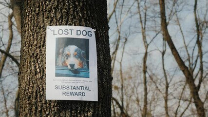 On the tree hangs a poster about the disappearance of the dog breed Australian Shepherd