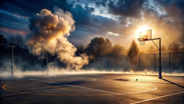 An outdoor basketball court at sunrise, shrouded in mist and a large plume of smoke, creates a mysterious and atmospheric scene.