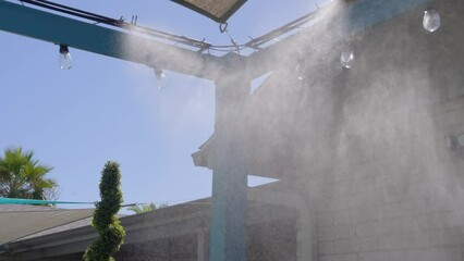 Water mister fan blows cool water into the air to cool down the area outside on a hot summer day