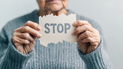 Portrait of Elderly Person Holding Torn 'STOP' Card, Highlighting the Impact of Abuse with Sad and Determined Expression