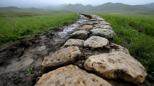 Ancient stone pathway winding through misty green meadows with mountains in background, creating atmospheric landscape for travel and nature photography.