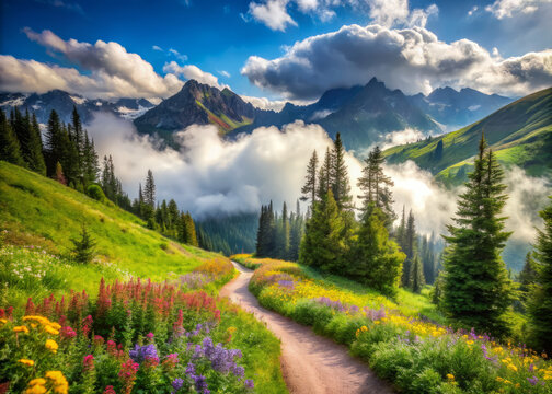 Breathtaking mountain trails wind through lush green forests, adorned with vibrant wildflowers and misty clouds. serene landscape invites exploration and tranquility