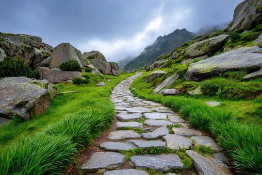 A picturesque stone path winding through lush green meadows towards misty mountains, inviting exploration and adventure in nature's embrace during a serene cloudy day.