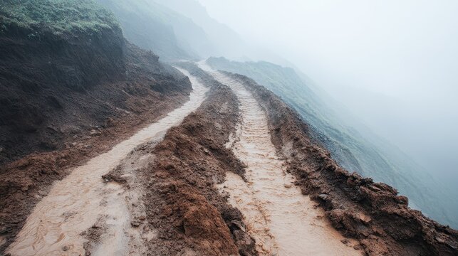 Winding dirt paths cut through misty mountains, revealing the raw beauty and rugged terrain that invites exploration and contemplation in nature's embrace.