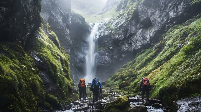 Misty mountain valley landscape with winding dirt path surrounded by greenery and fog, tranquil atmosphere, Copy Space.