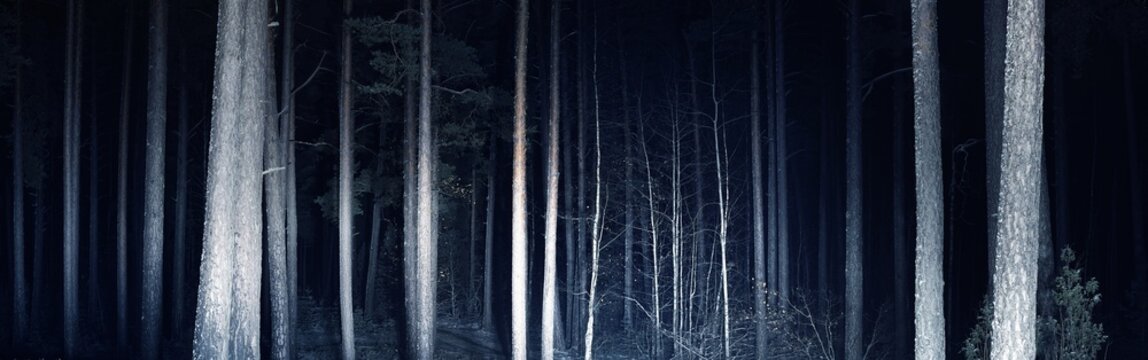 Illuminated forest at night. Mighty evergreen trees. Scary forest scene. Tree silhouettes in the dark