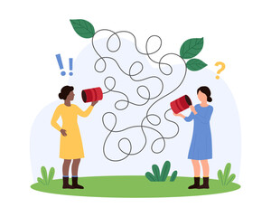 Bad business communication, misunderstanding barrier and discussion problem. Tiny people people listen to speech, unclear message and information through tangled phone line cartoon vector illustration