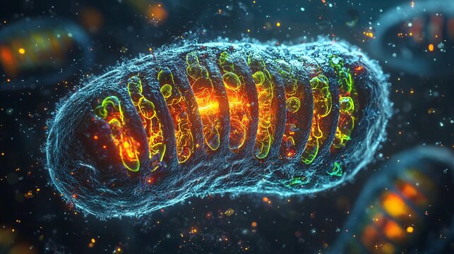 Macro photo of mitochondria with blue and orange glowing internal structures