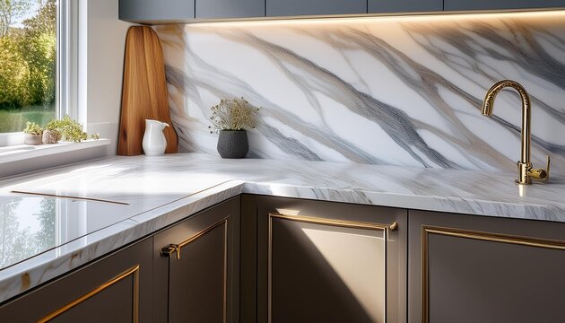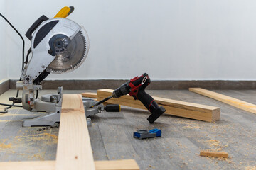 A close-up of an electric miter saw cutting through trim molding at a precise angle.