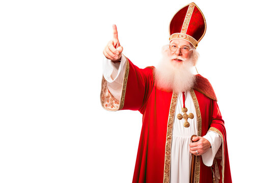 Sinterklaas or saint Nicholas pointing isolated on white background. Dutch character of Santa Claus