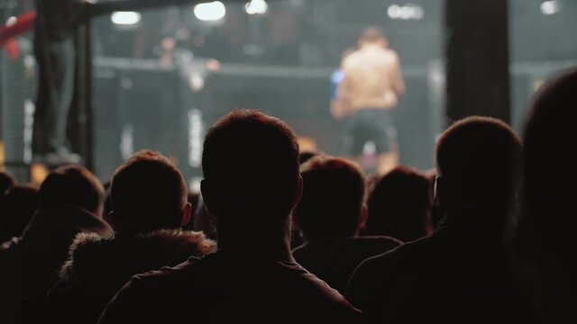 MMA fighters spar in boxing cage, blurred view from behind the heads of audience. Athletes in octagonal ring for fights, mixed martial arts competition tournament. Extreme sport