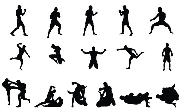 Silhouette set of mixed martial art mma fighter. Muay thai, wrestling, jujitsu, kickboxing, boxing.  Vector illustration