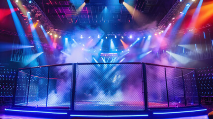 Empty mixed martial arts MMA cage in a dark arena with bright spotlights