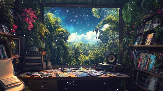 An eclectic music producera??s corner with a desk covered in mixtapes, a window view of a tropical jungle with vibrant flora, and a backdrop of a star-filled sky.