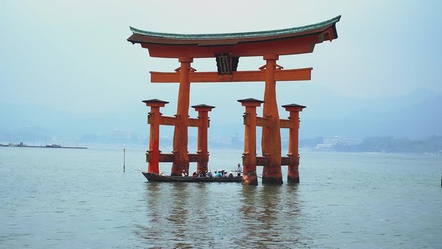 Miyajima, Japan - May, 2018: zoom in on boat passing under the famous floating torii in Miyajima