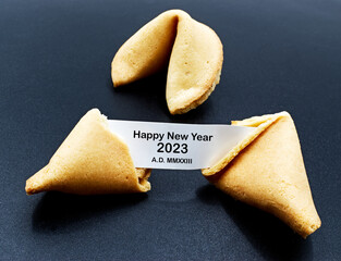 Happy New Year 2023 A.D. MMXXIII. Cracked Chinese fortune cookie with message.