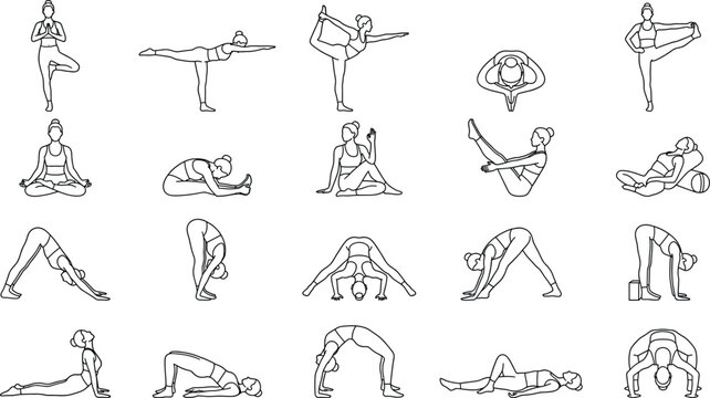 Minimal yoga pose line art icons collection featuring female figures in various asanas for fitness, meditation, wellness design, mobile apps, posters, and healthy lifestyle branding