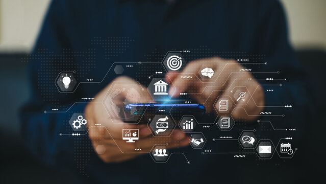 Businessman using mobile smartphone with data information banking network connection on screen, mobile banking and online payment.