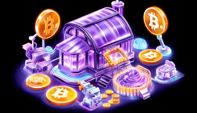 Cryptocurrency casino.  A vibrant, stylized depiction of a digital casino, using crypto like Bitcoin for gambling
