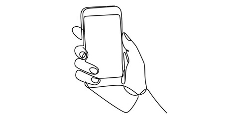 Continuous line art drawing of a human hand holding a modern smartphone, depicting mobile technology, digital communication, and internet interaction concept. Vector, illustration
