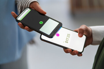 Close-up of two people using their mobile phones for tap to pay contactless payment One phone displays the amount to be paid, showing a modern and convenient transaction method