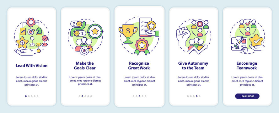 Improving employee motivation onboarding mobile app screen. Clear goals walkthrough 5 steps graphic instructions pages with linear concepts. UI, UX, GUI template. Myriad Pro-Bold, Regular fonts used