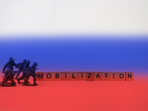 The word mobilization and soldiers on a light background. Mobilization in Russia.