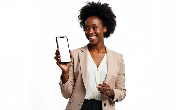 Happy young African American business woman holding big phone mock up screen display showing cellphone isolated at white background presenting mobile job search app smartphone mockup. High quality