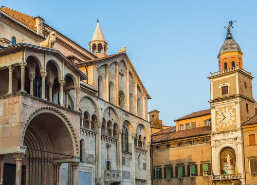 Sunrise view of the Cathedral of Modena and Ghirlandina tower in Italy