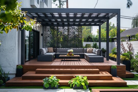 Outdoor patio with black and white laser cut panels, elegant modern design by Awmim Sib spacecraft designer in Los Angeles, featuring wooden steps, seating area, and greenery.
